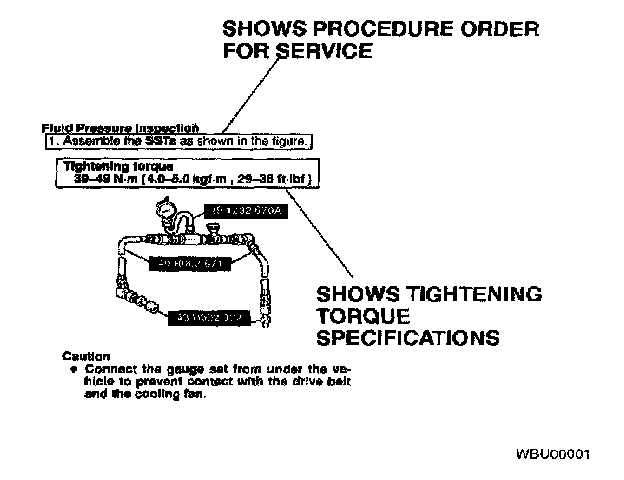 3. Procedure steps are numbered and the part that is the main point of that procedure is shown in the illustration with the corresponding number. Occasionally, there is important or additional information concerning a procedure. Refer this information when servicing the related part.