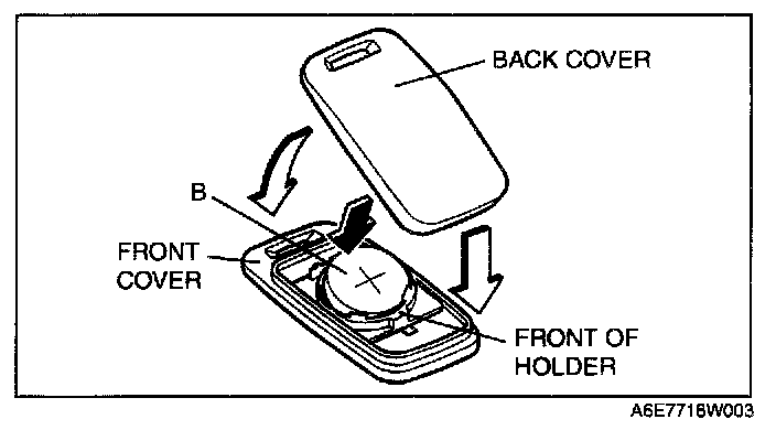 3. Install a new battery (CR2025) into the front portion of the holder with the positive pole (+) facing up. Press on the B portion of the battery to set the battery.