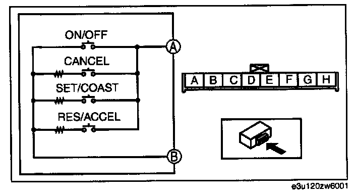 5. Inspect for resistance and continuity between cruise control switch terminals A-B using a tester.