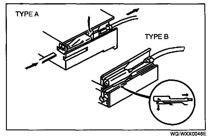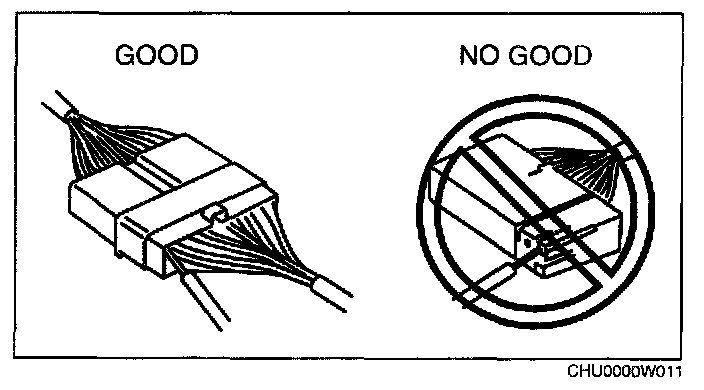 - When a tester is used to inspect for continuity or measuring voltage, insert the tester probe from the wiring harness side.