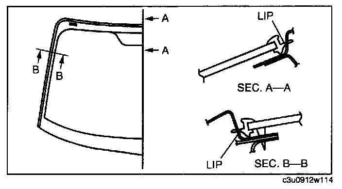 CAUTION: Proper installation of the windshield may be difficult if sealant is cracked or the glass is pushed out by air pressure when a door is opened/closed with all the window glass closed. Leave all the windows open until the windshield is installed completely.