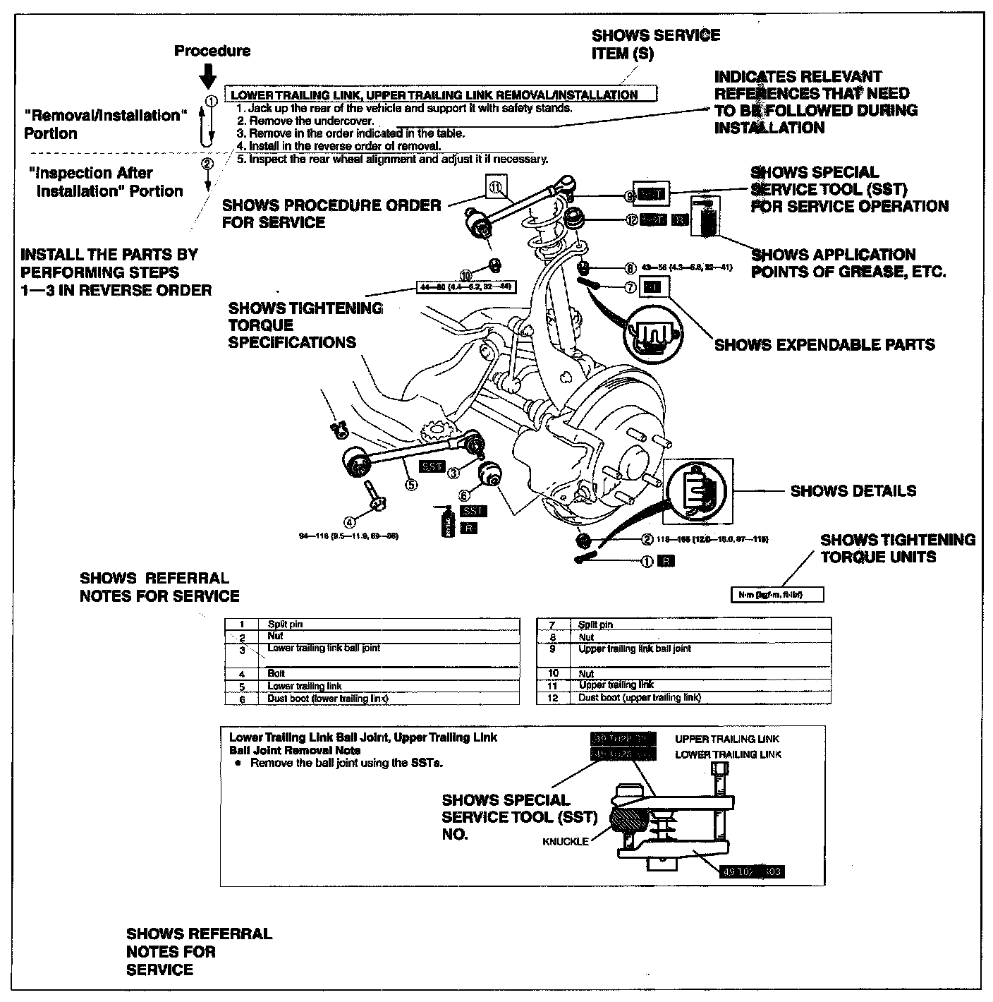 2. Expendable parts, tightening torques, and symbols for oil, grease, and sealant are shown in the overview illustration. In addition, symbols indicating parts requiring the use of special service tools or equivalent are also shown.