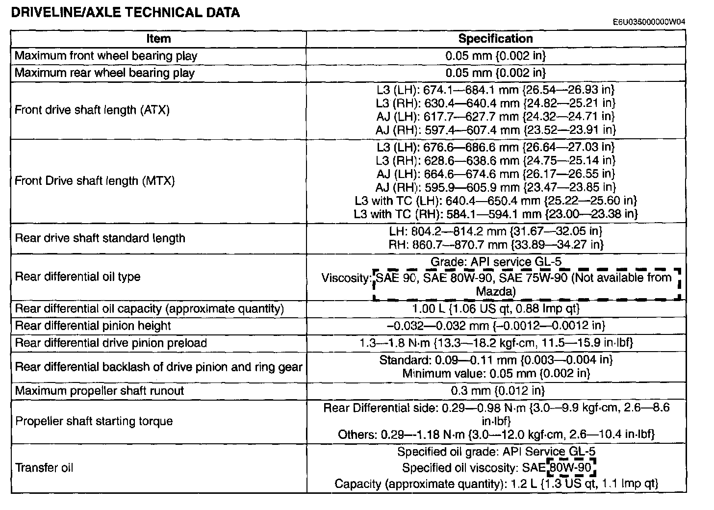 DRIVELINE/AXLE, TECHNICAL DATA: