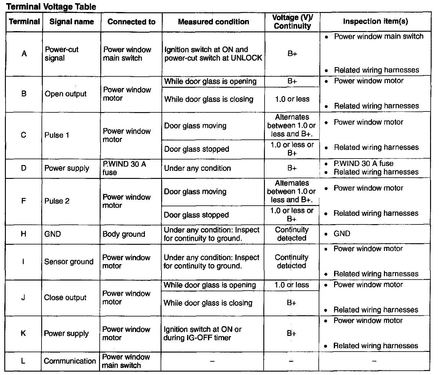 - If the voltage is not as specified in the Terminal Voltage Table, inspect the parts under "Inspection item(s)" and related wiring harnesses.
