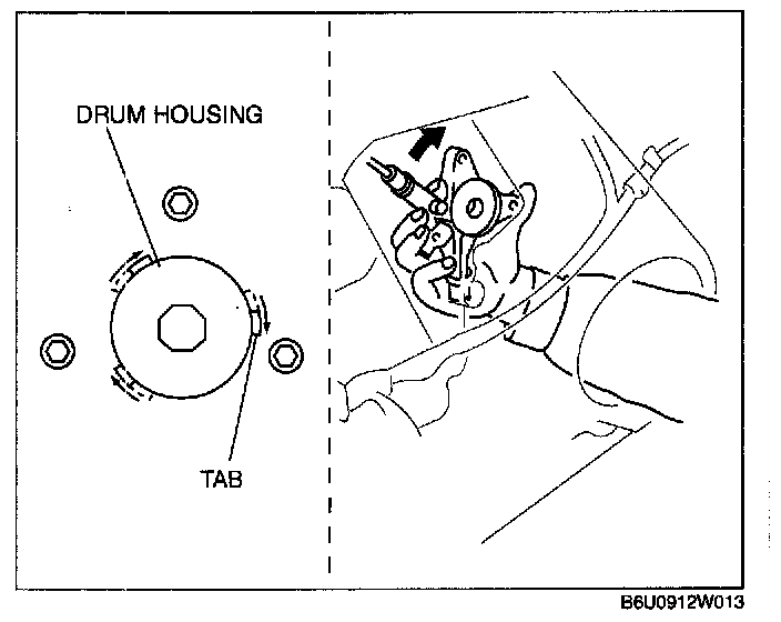 6. Insert hand through the speaker installation hole, rotate the regulator drum housing in the direction shown in the above figure, and disengage the regulator drum housing from the door unit connection tabs.