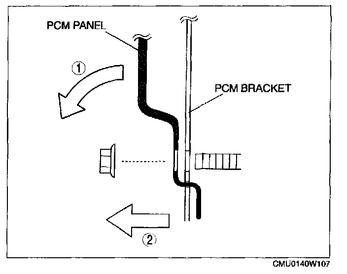 1. Before removing the PCM panel, pull the PCM connector harness stay fastener out from the PCM panel.