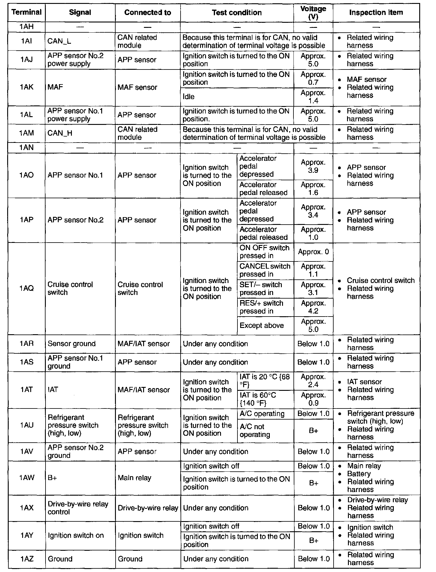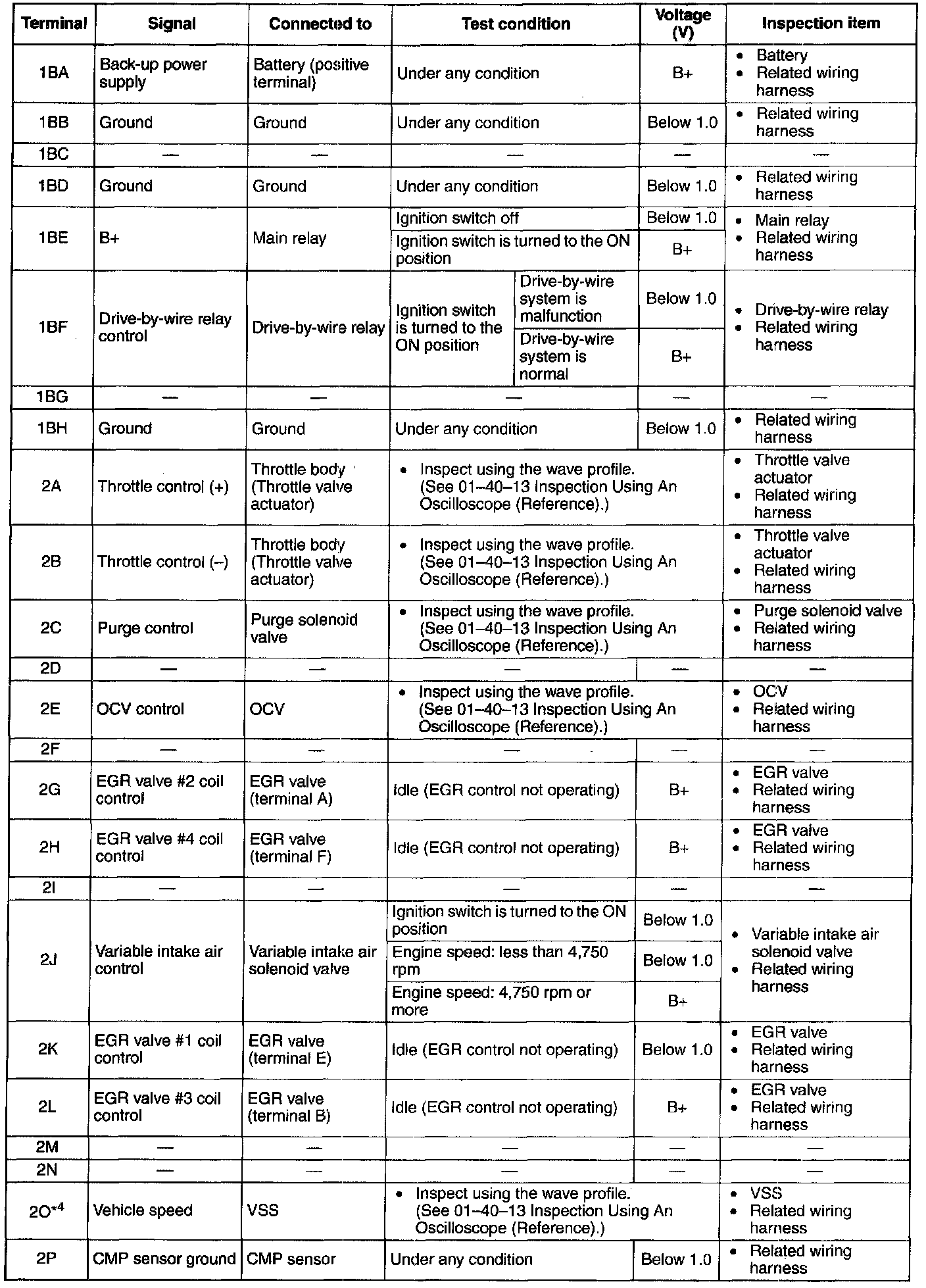 NOTE: The PCM terminal voltage can vary with the conditions when measuring and changes due to aged deterioration on the vehicle, causing false diagnosis. Therefore determine comprehensively where the malfunction occurs among the input systems, output systems, and the PCM.