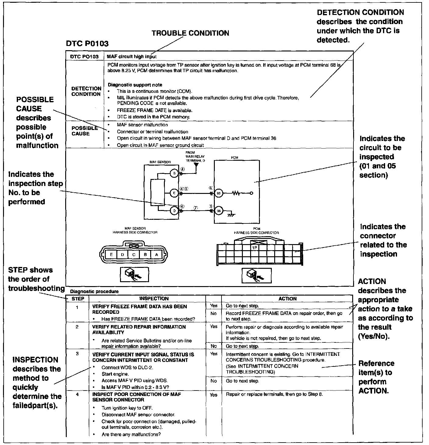- DTC troubleshooting flow shows diagnostic procedures, inspection methods, and proper action to take for each DTC.