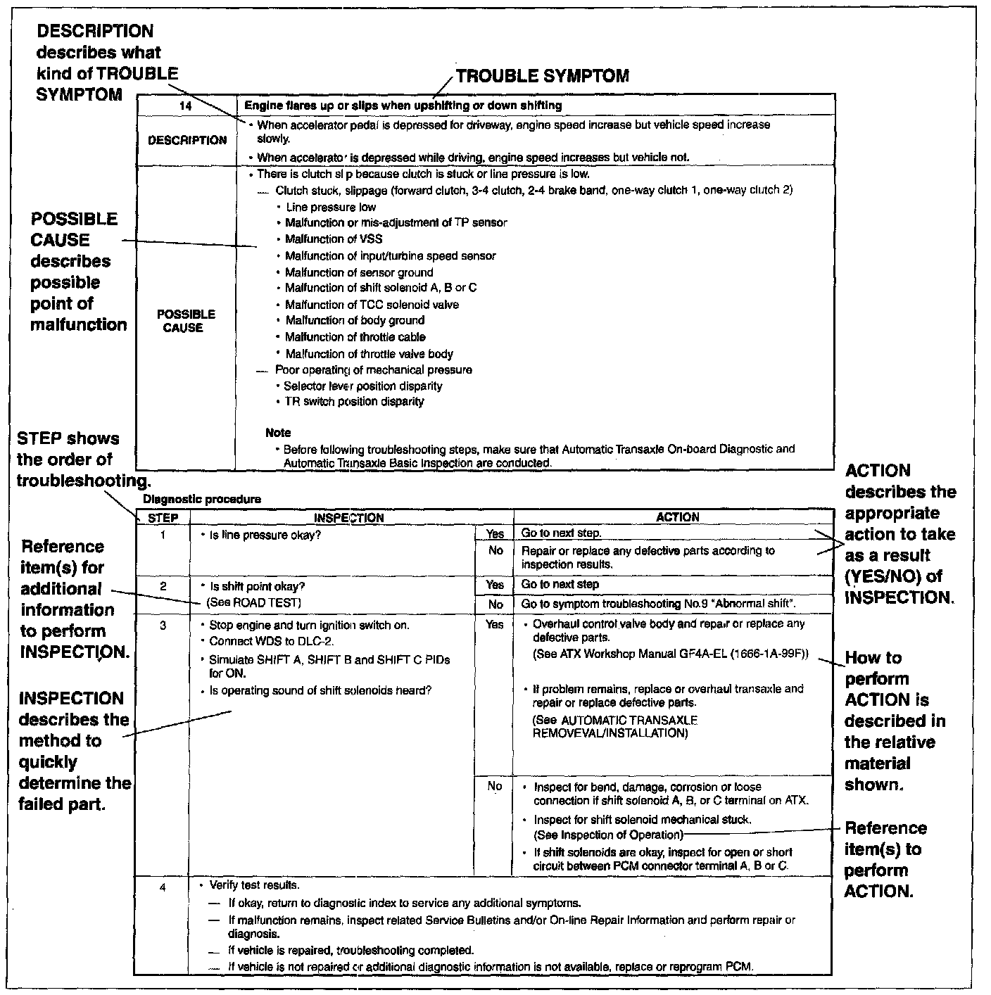 - Symptom troubleshooting shows diagnostic procedures, inspection methods, and proper action to take for each trouble symptom.