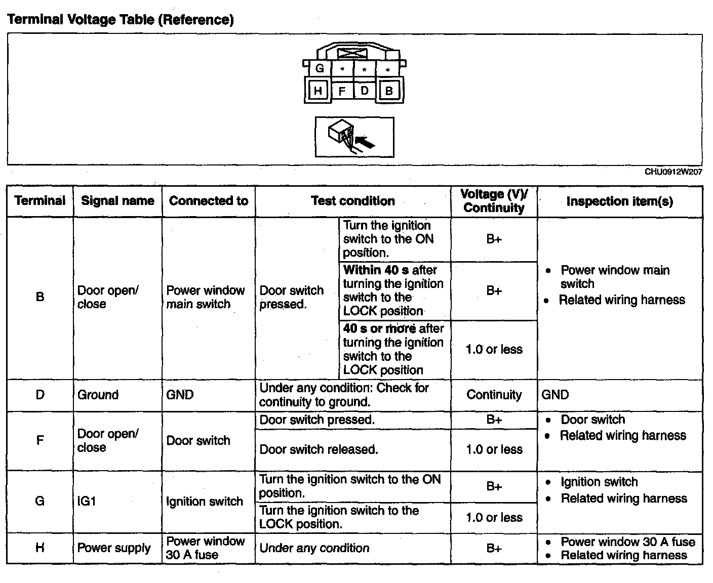 1. Measure voltage or inspect for continuity according to the Terminal Voltage Table (Reference).