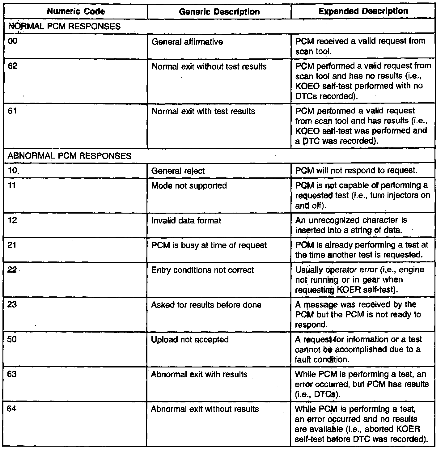 It is possible to receive a communication error from a WDS or equivalent tester when initiating a diagnostic test or accessing PIDs. The communication error can be caused by operator error, the vehicle wiring, connectors, the PCM or other control modules connected to the DLC wiring. The PCM will respond to a WDS or equivalent tester whenever the tool requests a test. These are not DTCs. Listed below are numeric codes and generic descriptions that a scan tool may display when trying to perform some PCM operations. It is possible to get other numeric codes not listed. For a complete list of communication response codes, See society of automotive engineers (SAE) document J2190 enhanced E/E Diagnostic Test Modes. Some are normal responses to valid requests. The others are communication error responses.