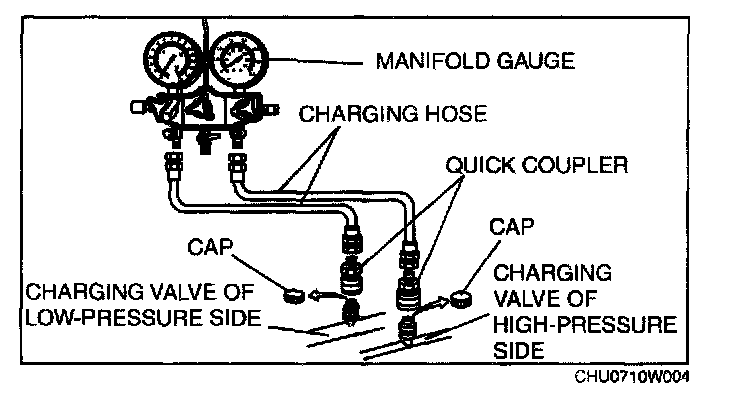 2. Connect the charging hoses to the high and low-pressure side joints of the manifold gauge.