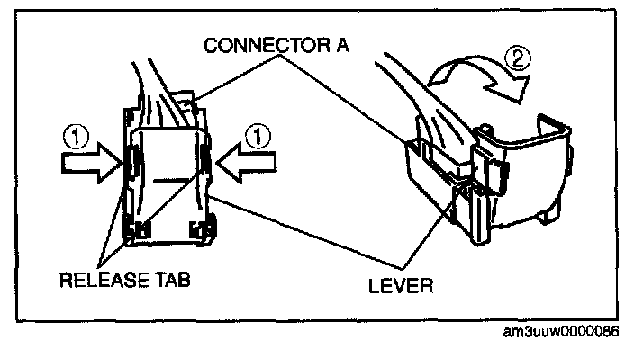 2. Rotate the lever in the direction of the arrow and remove connector A.