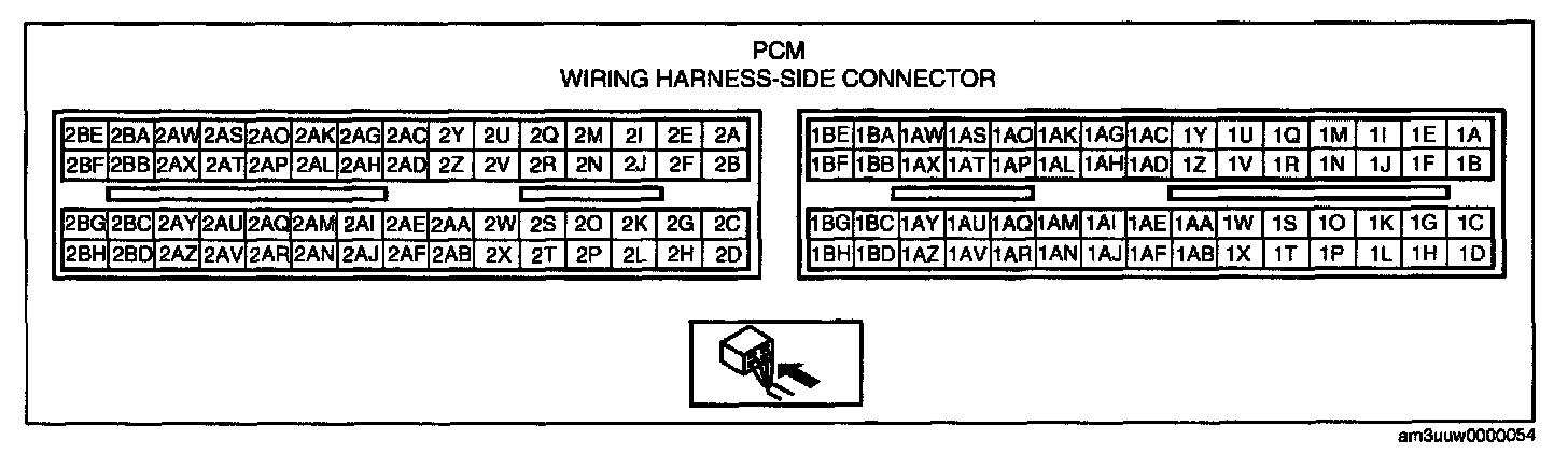 NOTE: The PCM terminal voltage can vary with the conditions when measuring and changes due to aged deterioration on the vehicle, causing false diagnosis. Therefore determine comprehensively where the malfunction occurs among the input systems, output systems, and the PCM.