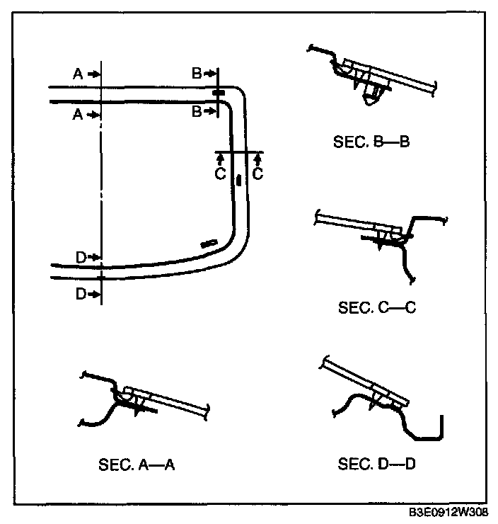 4. If installing a reused rear window glass, install the rear window glass molding according to the following procedure.