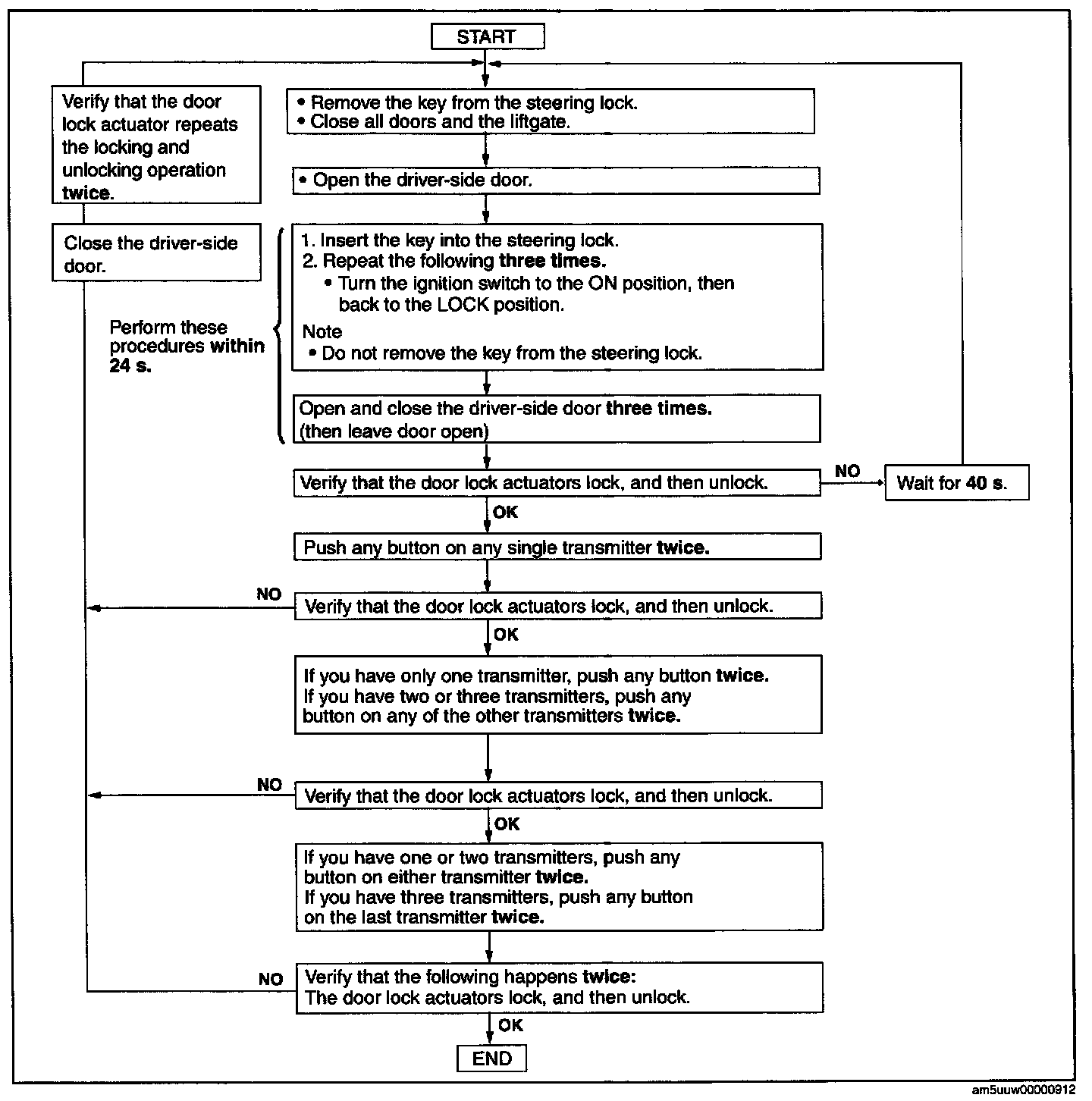 - After ID code programming, remove the key from the steering lock and verify that all doors lock/unlock normally using the transmitter.