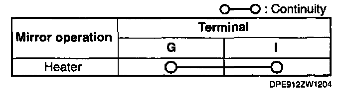 2. Inspect for continuity between the power outer mirror heater terminals.