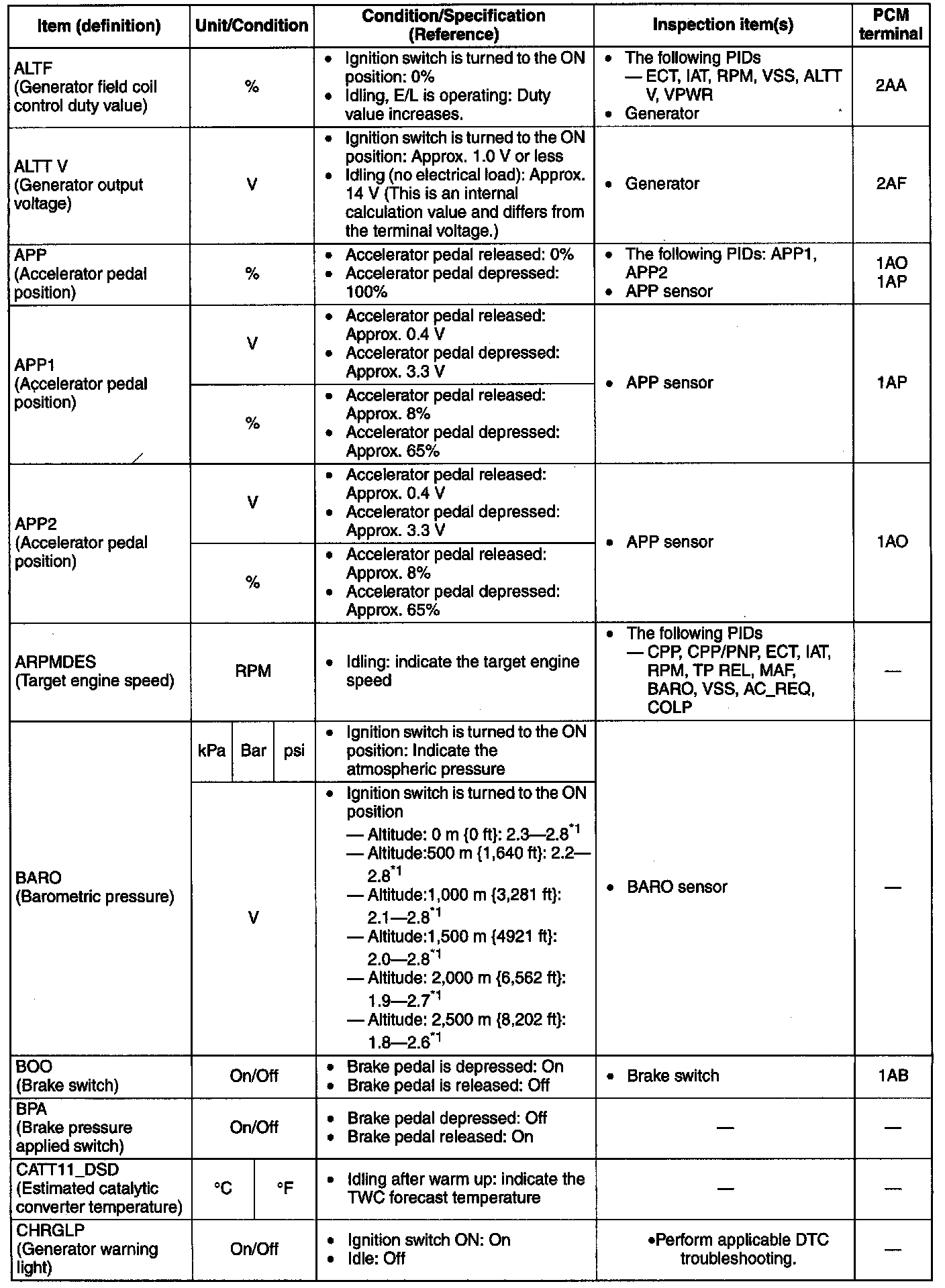 - If PID value is not within the specification, follow the instructions in Action column.