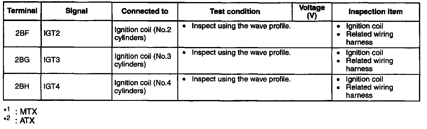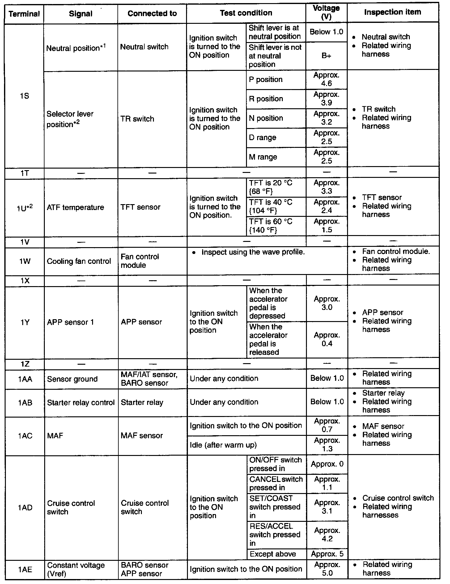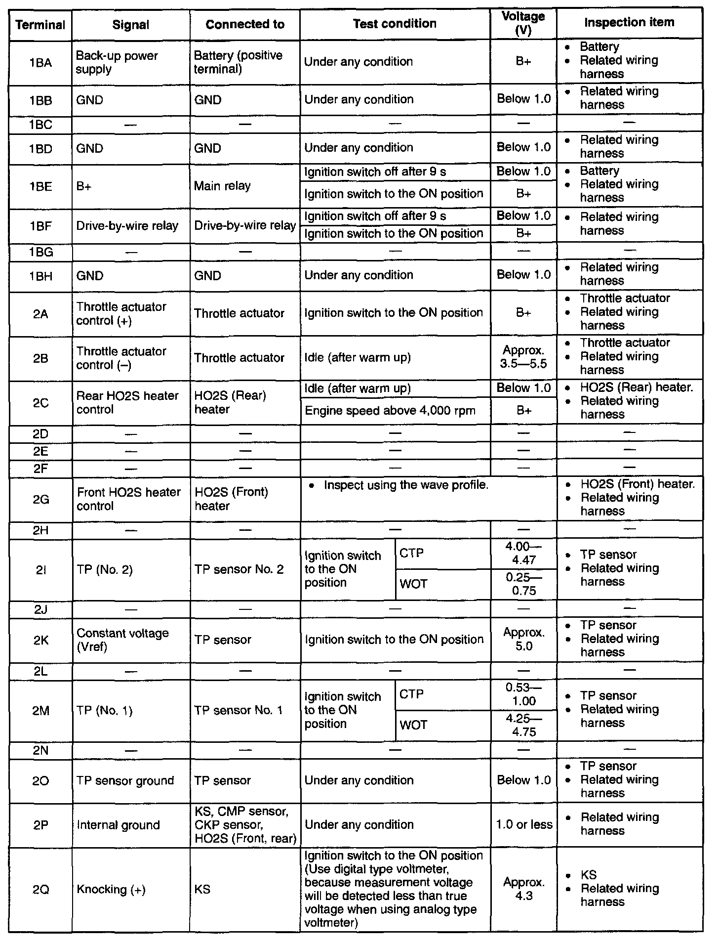 NOTE: The PCM terminal voltage can vary with the conditions when measuring and changes due to aged deterioration on the vehicle, causing false diagnosis. Therefore determine comprehensively where the malfunction occurs among the input systems, output systems, and the PCM.