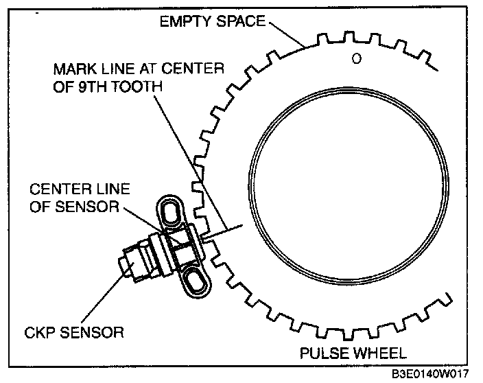 3. Install the CKP sensor where the center line marked in Step 2 and the CKP sensor center line are aligned.