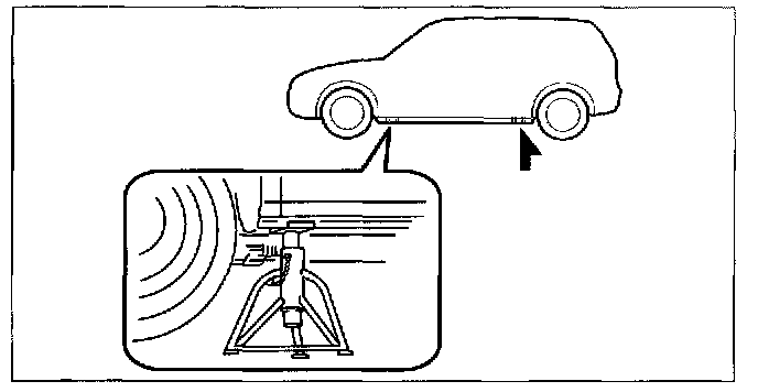 CAUTION: Place a board (approx. 20 mm (0.78 in) thick) between the rear crossmember and the jack to prevent damage to the crossmember.