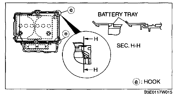 1. Assemble with battery box hooks E aligned with the battery tray holes at two points.