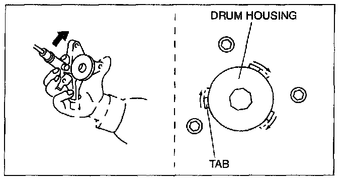 5. Insert a hand through the service hole, rotate the drum housing in the direction shown in the figure and disengage the tabs from the sliding door module.