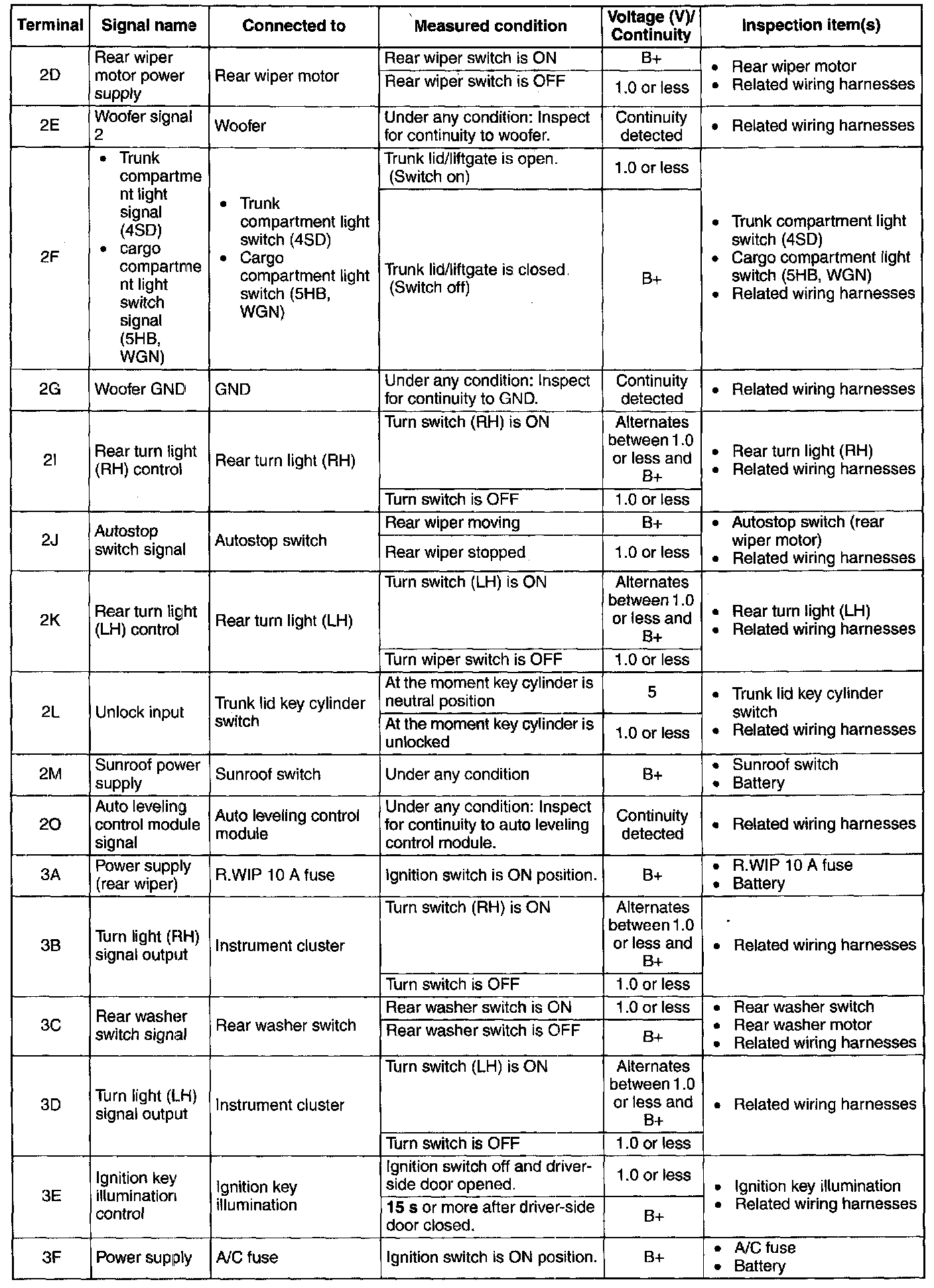 1. Measure the voltage or inspect for continuity according to the Terminal Voltage Table (Reference).