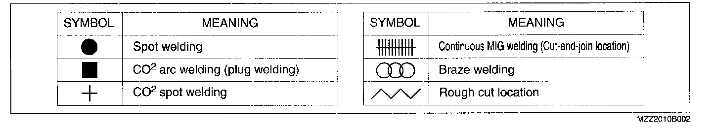 The 6 symbols are used to indicate the type of weld that is used when replacing body panels.