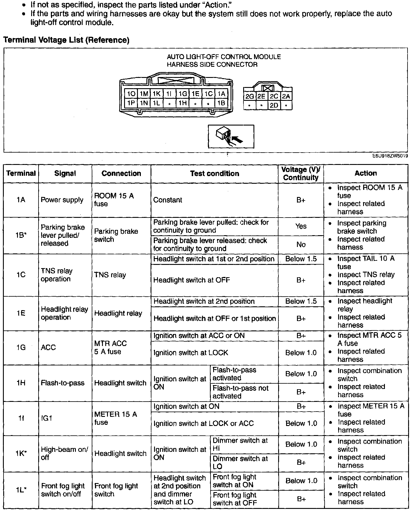 AUTO LIGHT-OFF CONTROL MODULE INSPECTIONTerminal Voltage List (Reference) Terminals - (1A - 1L):