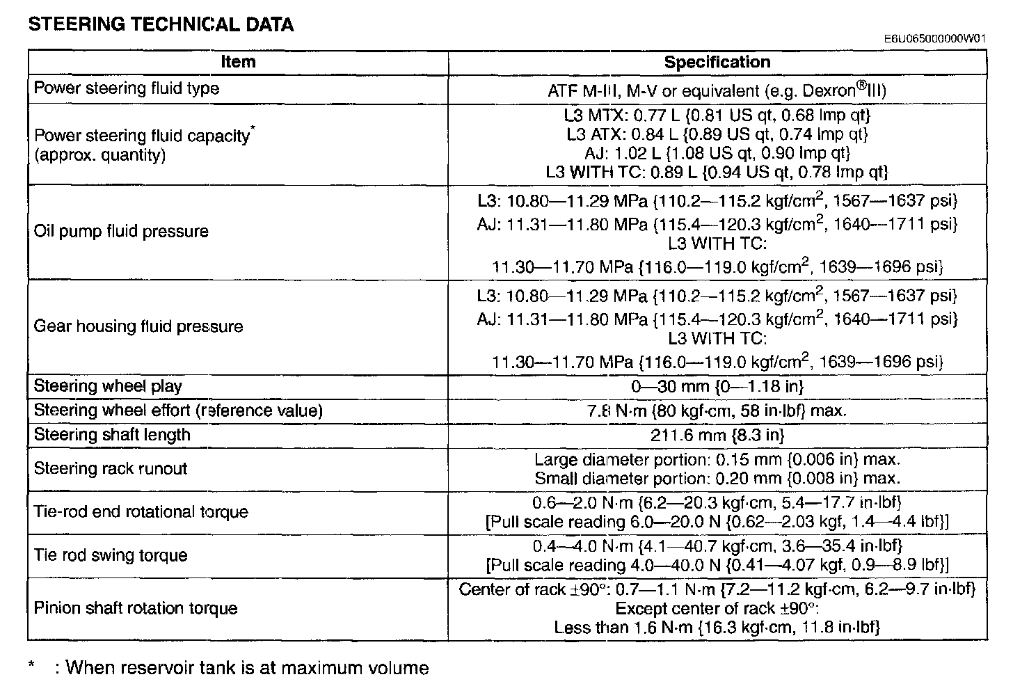 STEERING TECHNICAL DATA: