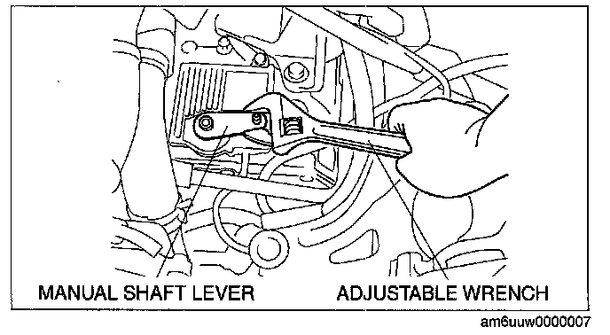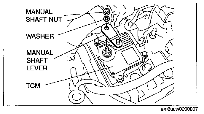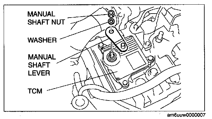 Caution: Do not use an impact wrench. Hold the manual shaft lever when removing the manual shaft nut, or the transaxle may be damaged.