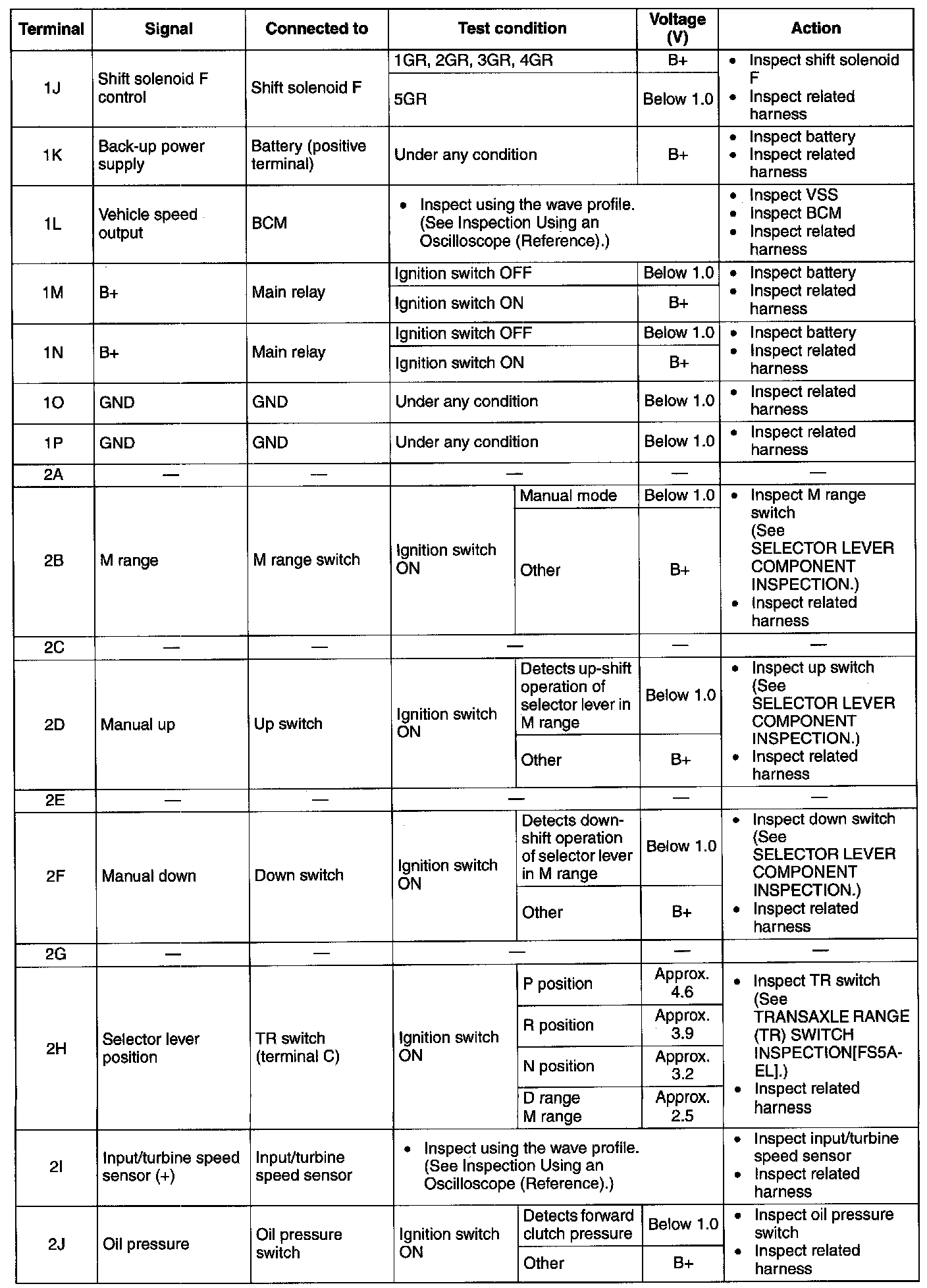 TCM INSPECTION [FS5A-EL]Caution: The TCM terminal voltages vary with changes in measuring and vehicle conditions. Always carry out a total inspection of the input and output systems, and the TCM to determine the cause of trouble. Otherwise, a mis-diagnosis could occur.