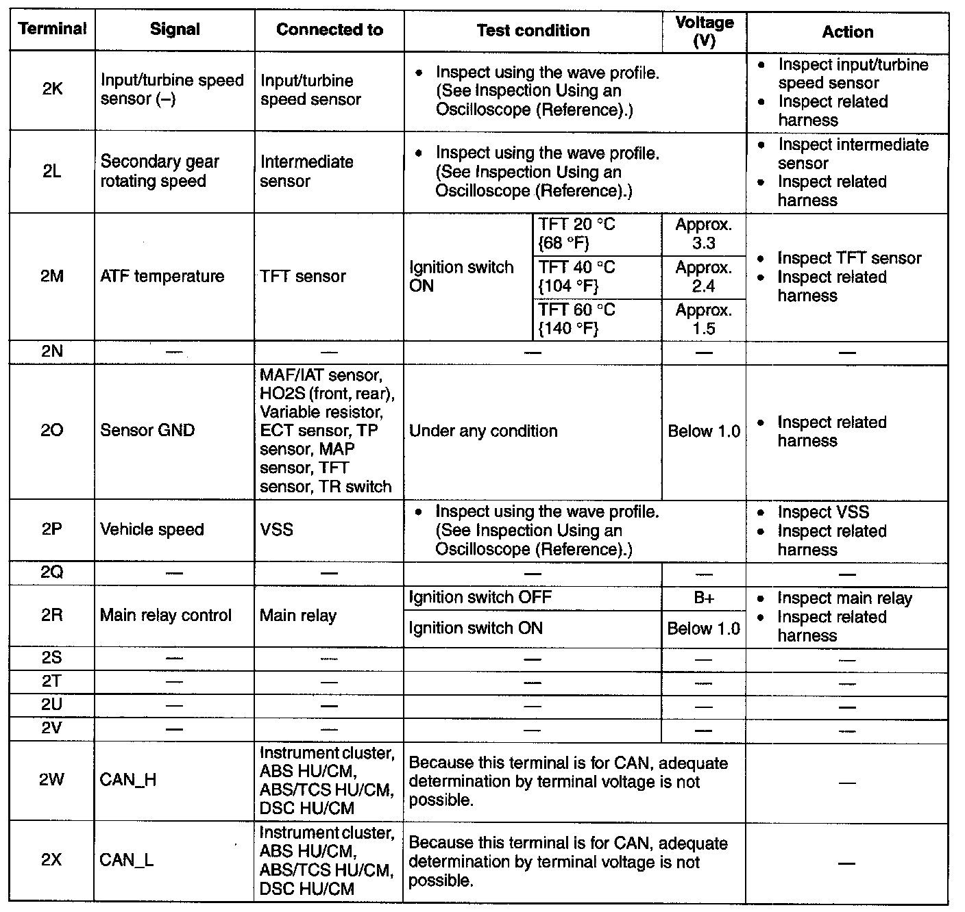 ^ If any incorrect voltage is detected, inspect the related system(s), wiring harnesses and connector(s) referring to the Action column in the terminal voltage table.