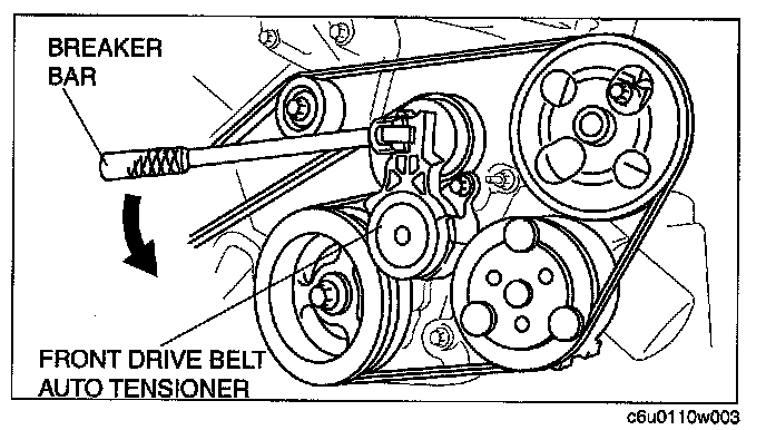 2. Set a breaker bar on the center of the front drive belt auto tensioner pulley as shown.