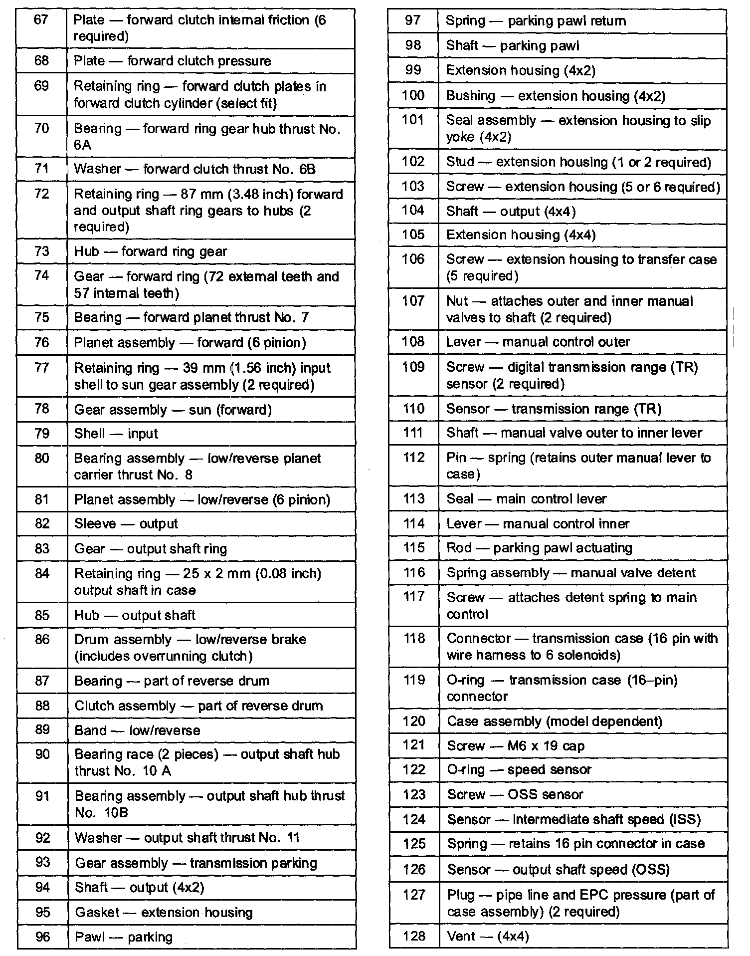 Power is transmitted from the torque converter to the planetary gearsets through the input shaft. Bands and clutches are used to hold and drive certain combinations of gearsets. This results in five forward ratios and one reverse ratio, which are transmitted to the Output shaft and differential.
