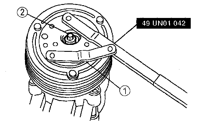 1. Hold the A/C clutch hub with the Spanner Wrench ST49-UN01-042.