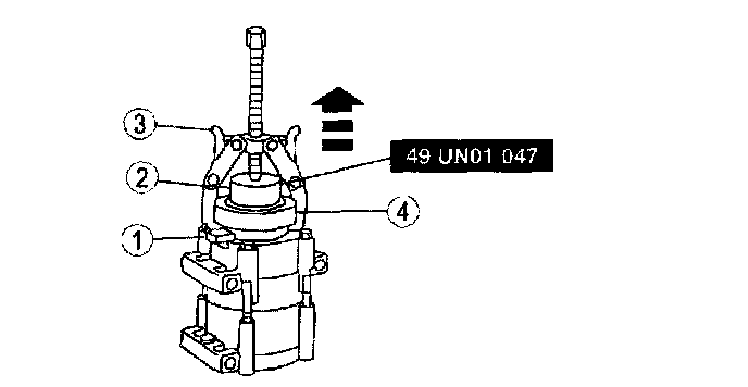 3. Install a 2-jaw puller on the compressor with tip of the puller forcing screw in the center pilot. Place the jaws of the puller around the back edge of the field coil Tighten the puller forcing screw to pull coil from compressor.