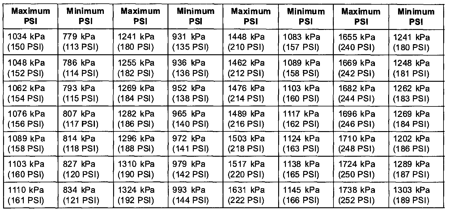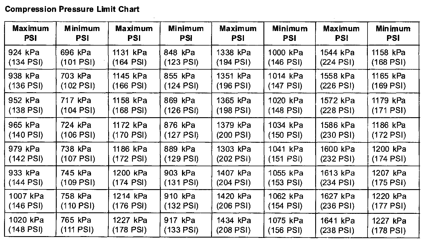 Compression Test - ResultsThe indicated compression pressures are considered within specification if the lowest reading cylinder is at least 75% of the highest reading. The following Compression Pressure Limit Chart shows acceptable pressure ranges. Use the highest compression reading obtained from the compression test and verify that the lowest compression reading is within the range shown in the chart. See the Compression Pressure Limit Chart.