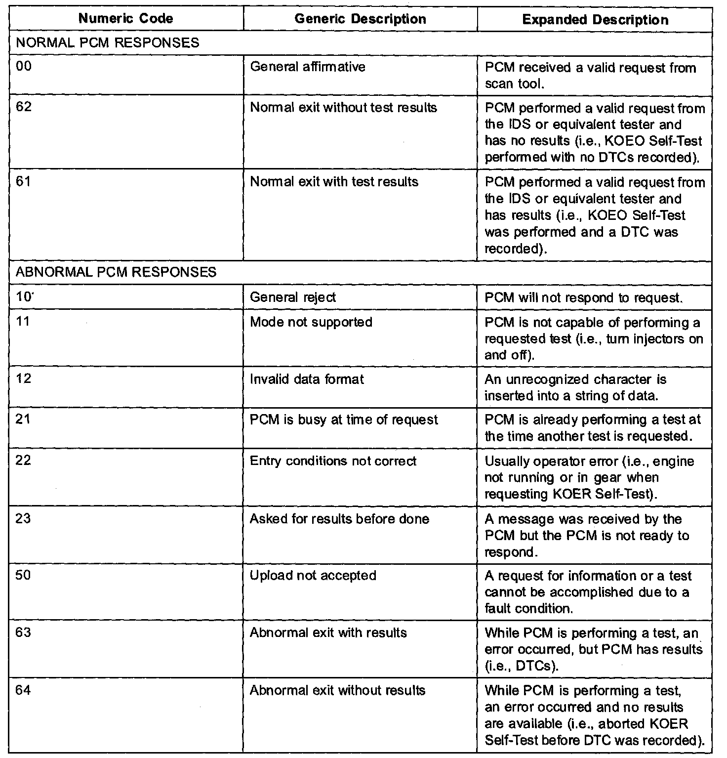 Communication ErrorIt is possible to receive a communication error from a IDS or equivalent tester when initiating a diagnostic test or accessing PIDs. The communication error can be caused by operator error, the vehicle wiring, connectors, the PCM or other control modules connected to the DLC wiring. The PCM will respond to a IDS or equivalent tester whenever the tool requests a test. These are not DTCs. Listed below are numeric codes and generic descriptions that a scan tool may display when trying to perform some PCM operations. It is possible to get other numeric codes not listed. Fora complete list of communication response codes, see Society of Automotive Engineers(SAE) document J2190 enhanced E/E Diagnostic Test Modes. Some are normal responses to valid requests. The others are communication error responses.