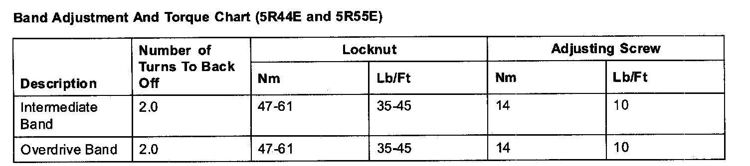 Band Adjustment And Torque Chart (5R55E 5R44E):