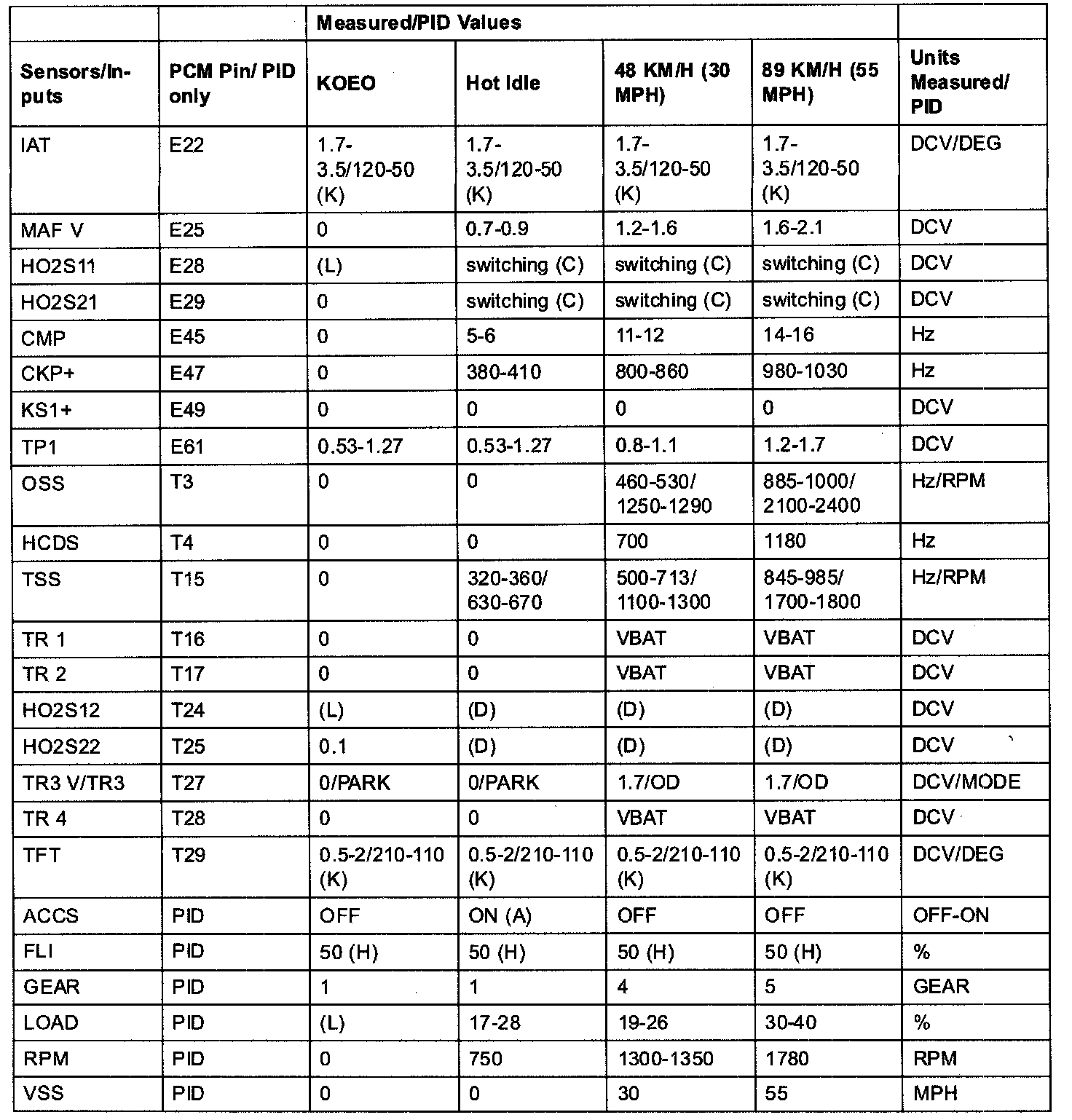 PID/DATA MONITOR ITEM TABLE