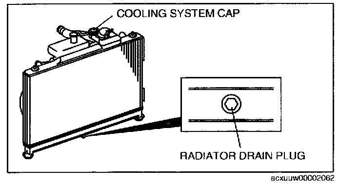 ^ Never remove the cooling system cap or loosen the radiator drain plug while the engine is running, or when the engine and radiator are hot. Scalding engine coolant and steam may shoot out and cause serious injury. It may also damage the engine and cooling system.