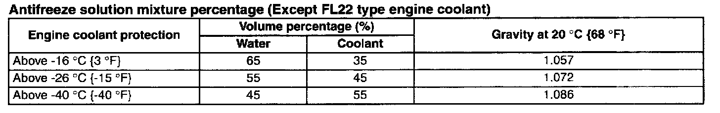 Antifreeze Solution Mixture Percentage (except FL22 Type Engine Coolant):