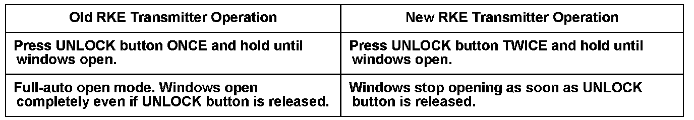 Please inform the customer the RKE transmitter will now work when the UNLOCK button is pushed TWICE and held until the windows open.