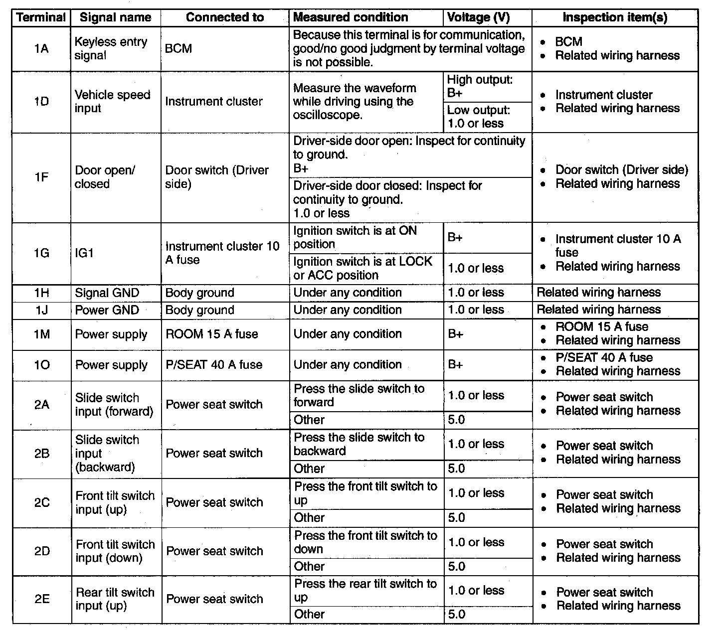 POSITION MEMORY CONTROL MODULE INSPECTION1. Measure the voltage at each terminal is as indicated in the Terminal Voltage Tables.