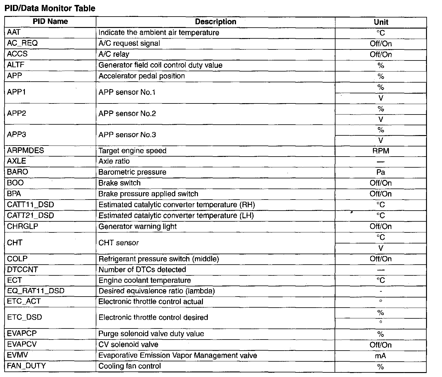 PID/Data Monitor Table Part 1: