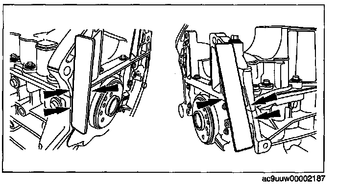 Using a straightedge, align the oil pan flush with the rear of the cylinder block at the two areas as shown.