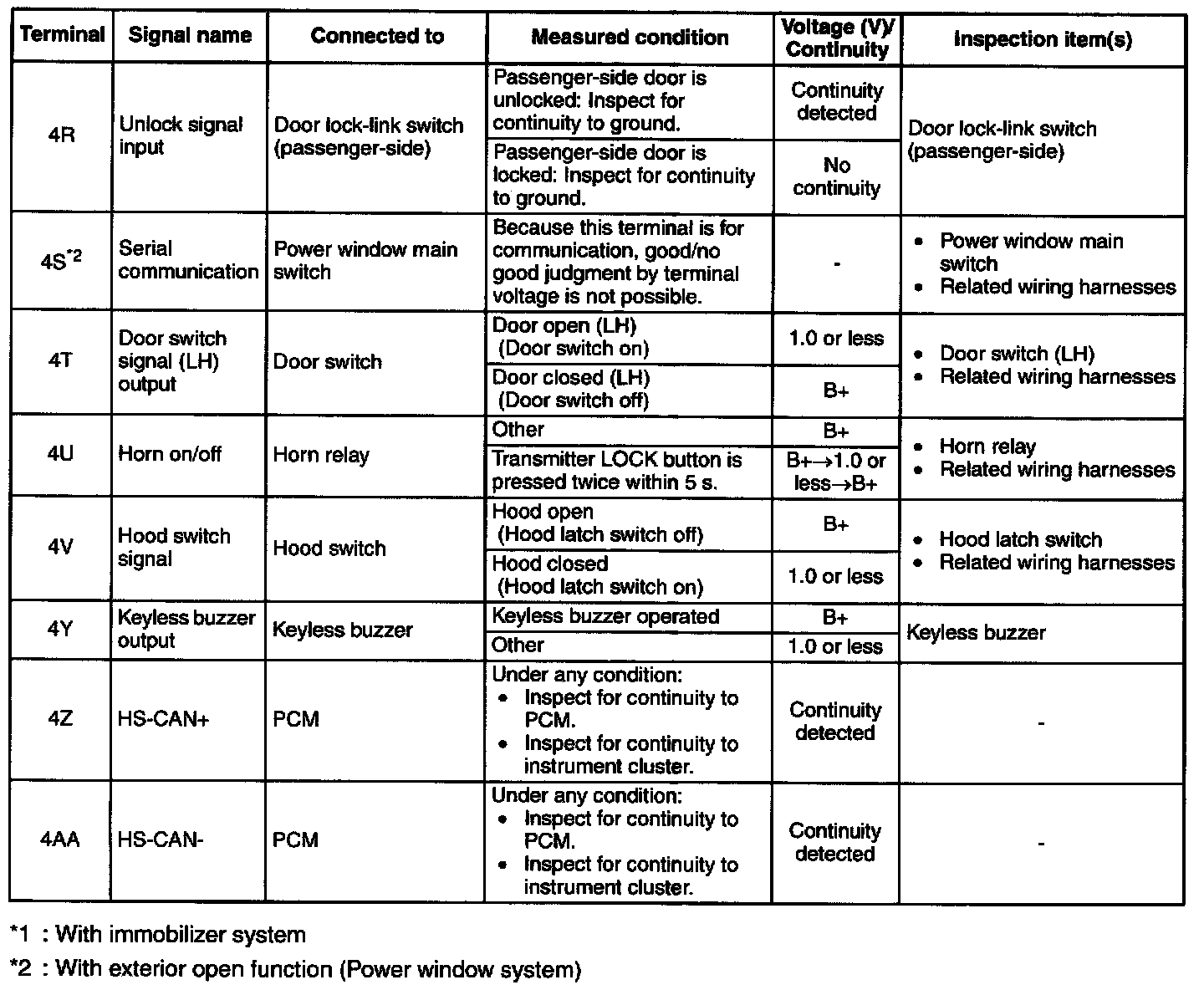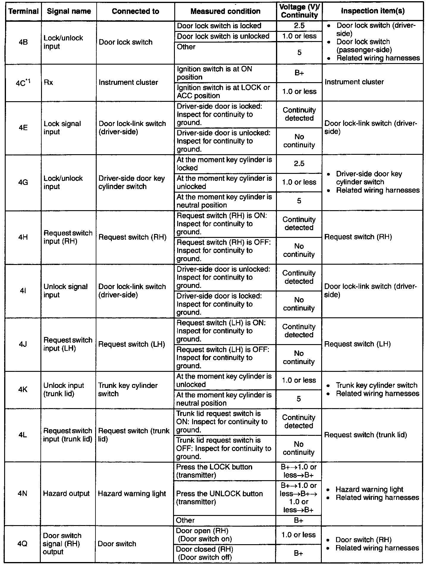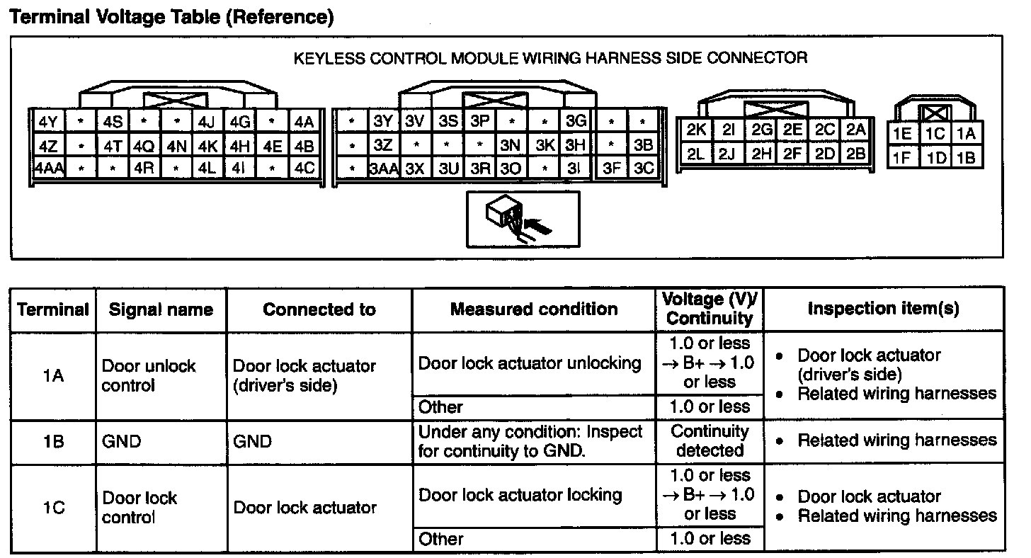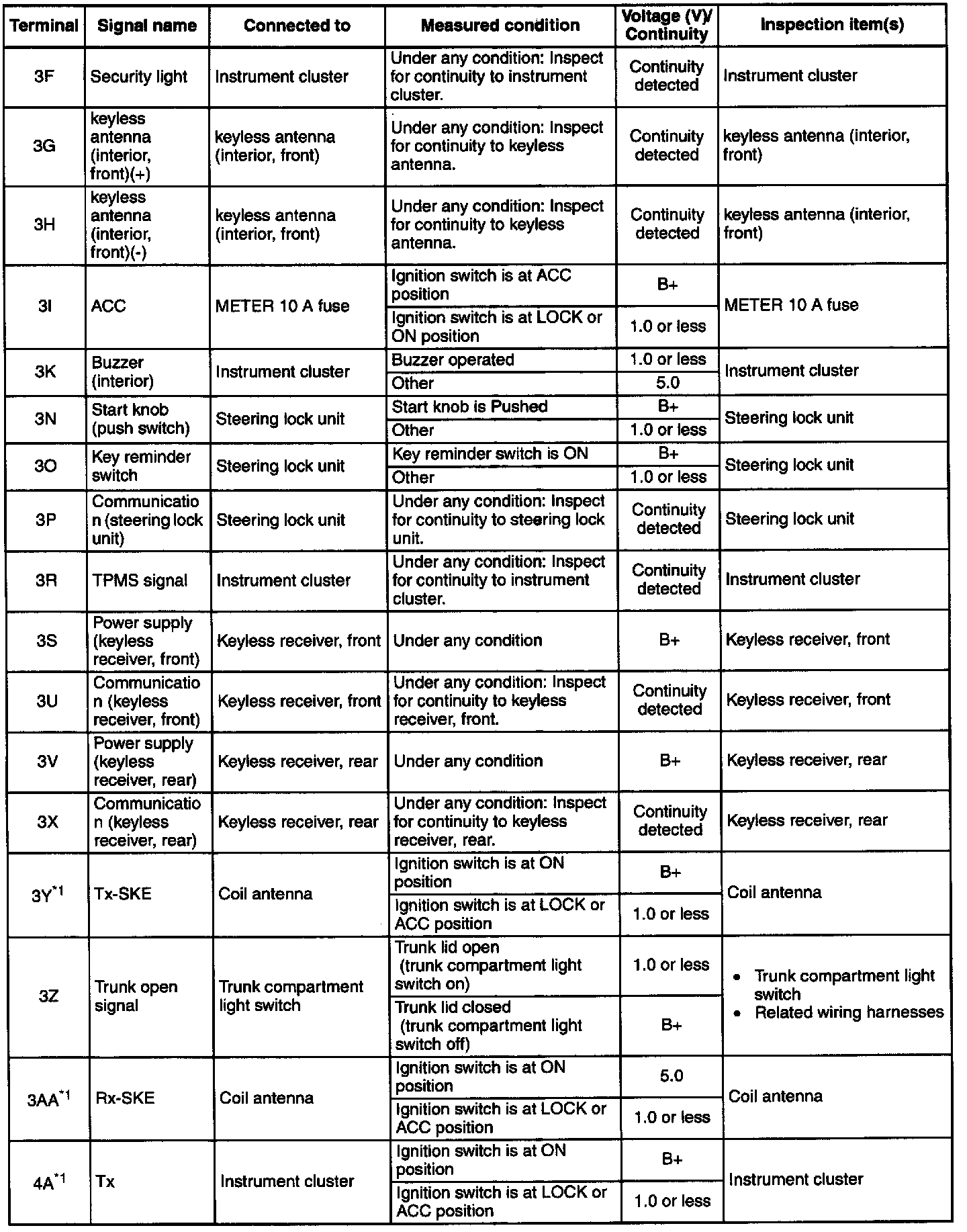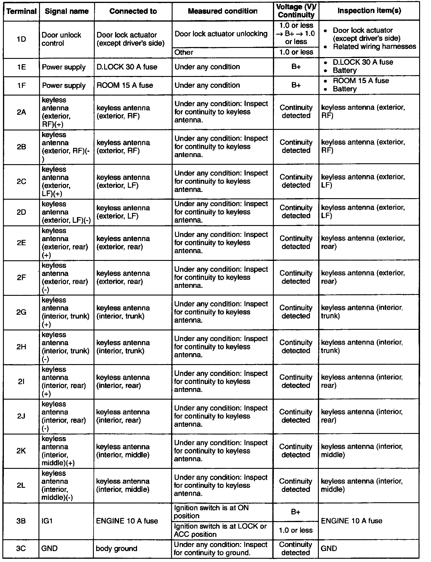 KEYLESS CONTROL MODULE INSPECTION[ADVANCED KEYLESS SYSTEM]Terminal Voltag Table (Reference) Part 1: