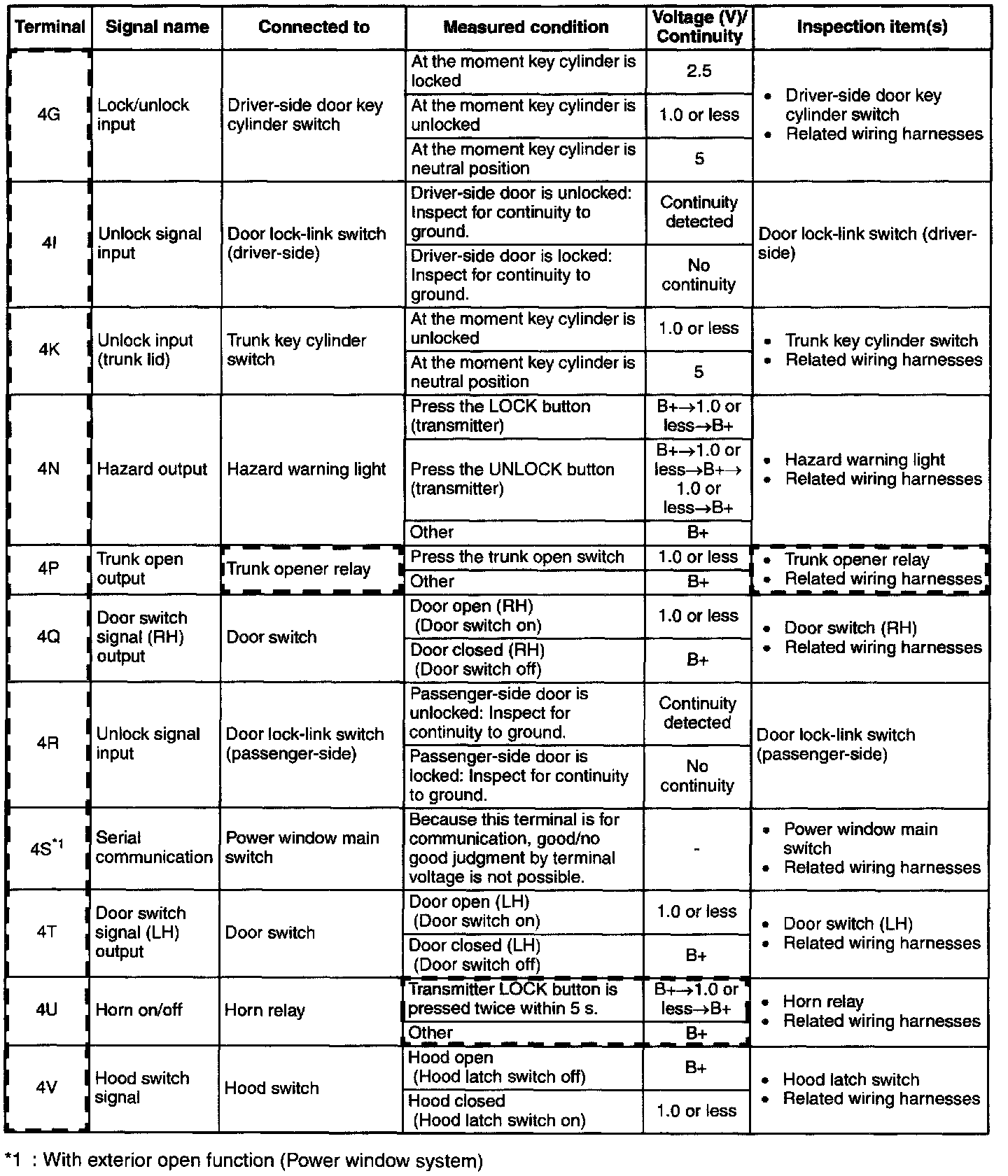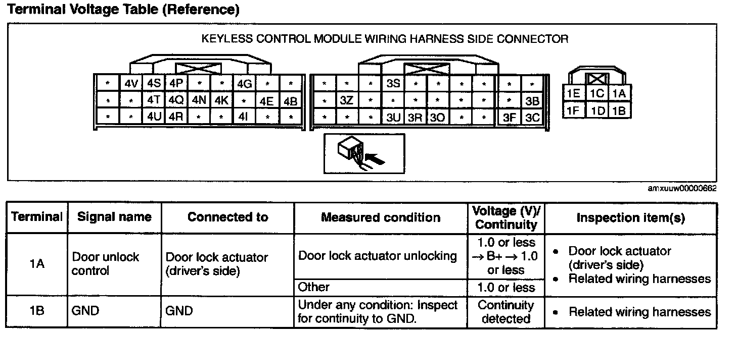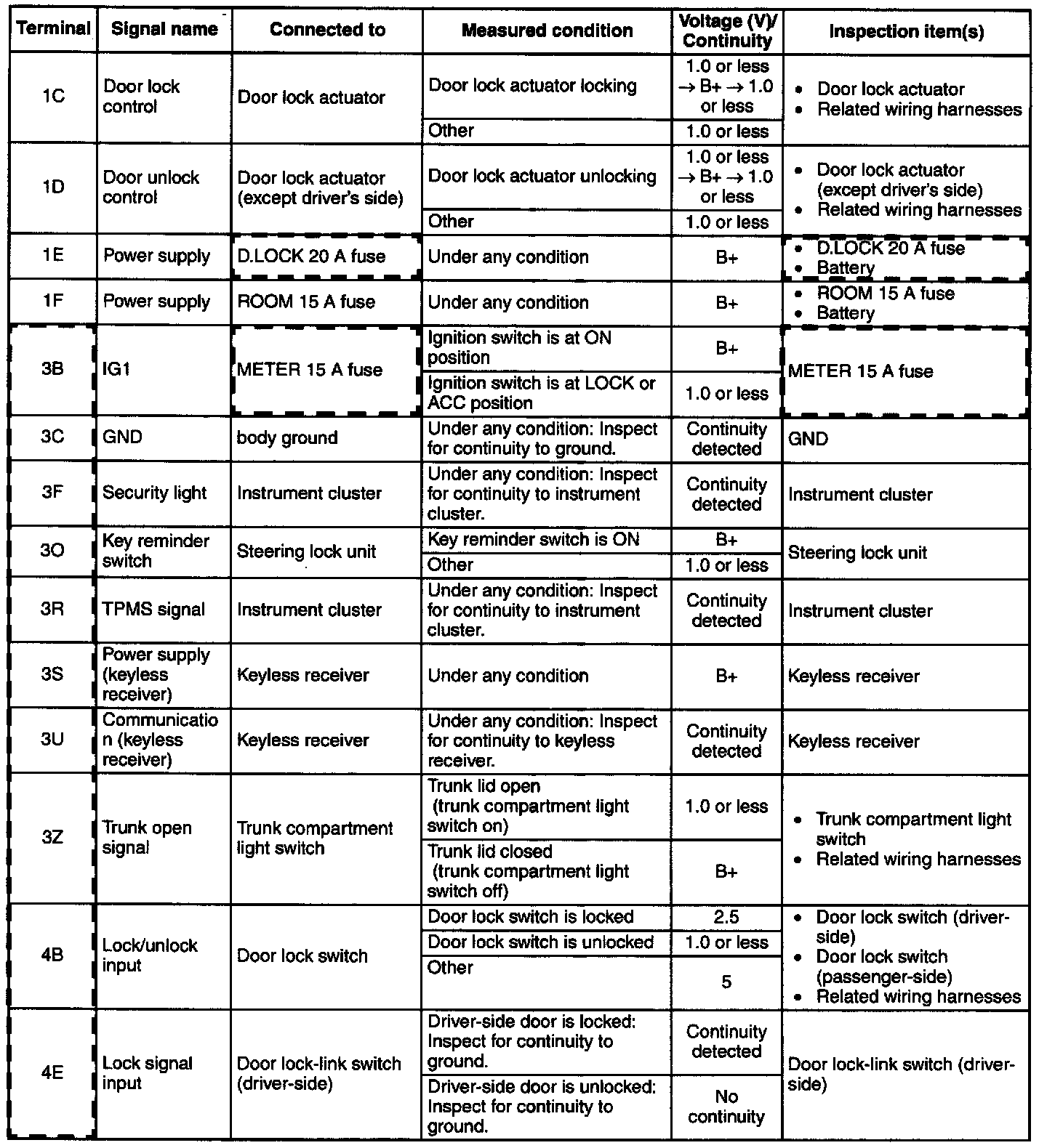 KEYLESS CONTROL MODULE INSPECTION[KEYLESS ENTRY SYSTEM]Terminal Voltage Table (Reference) Part 1: